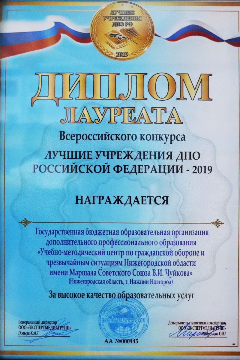 По решению Оргкомитета Всероссийского конкурса «Лучшие образовательные учреждения Российской Федерации – 2019 г.», Научно-исследовательским центром «Экспертмедиагрупп» Учебно-методический центр по гражданской обороне и чрезвычайным ситуациям Нижегородской области им. Маршала Советского Союза В.И. Чуйкова (далее – Центр) за высокое качество предоставляемых образовательных услуг включен в перечень лучших образовательных учреждений дополнительного профессионального образования Российской Федерации.